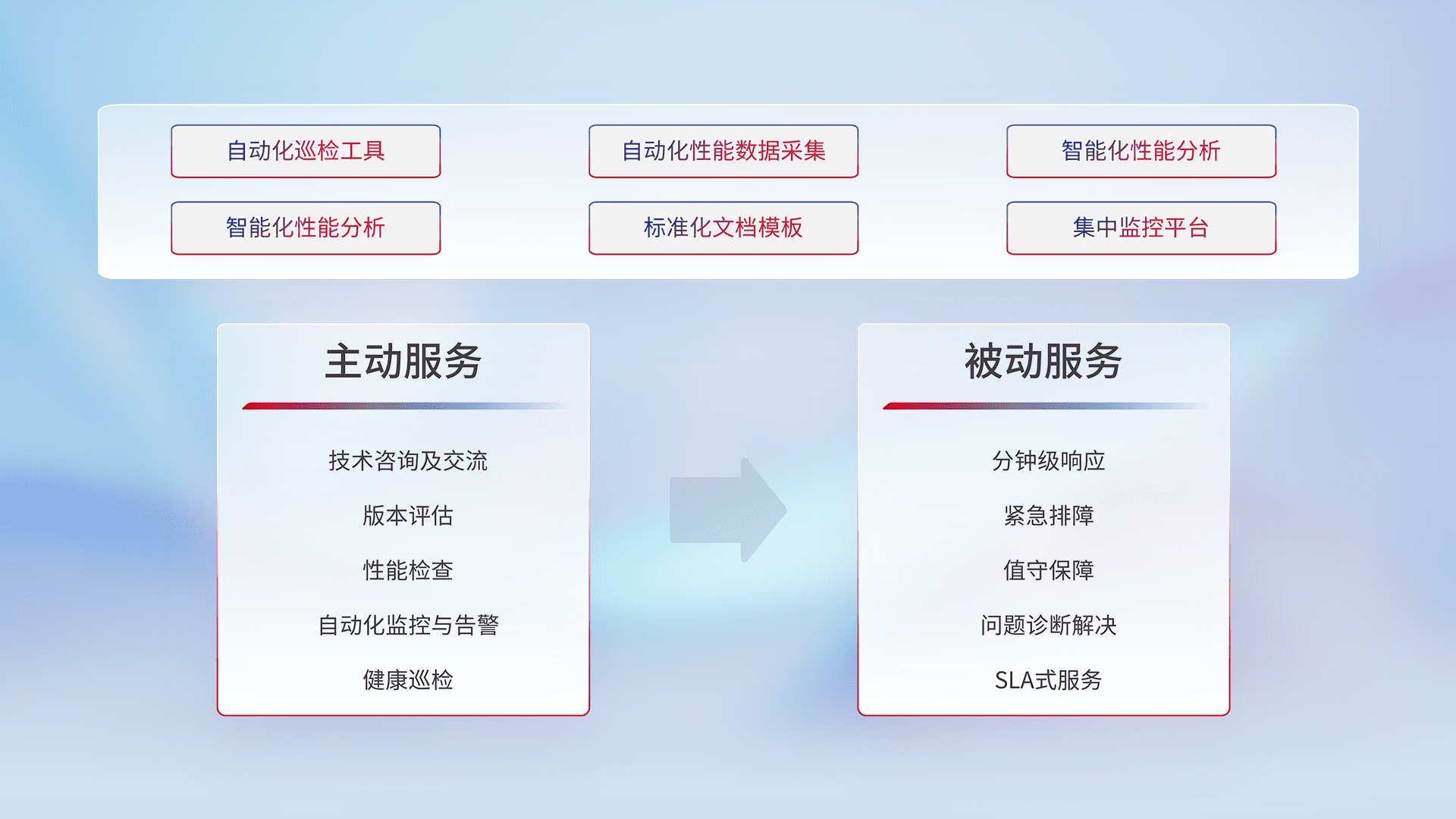智能化工具和标准化文档,,保障服务质量,,,,提供主动服务(包含技术咨询、、、、版本评估、、、性能检查、、、、自动化监控与告警、、、健康巡检)和被动服务包含(分钟级响应、、、、紧急排障、、值守保障、、、、问题诊断解决、、、SLA服务)。。