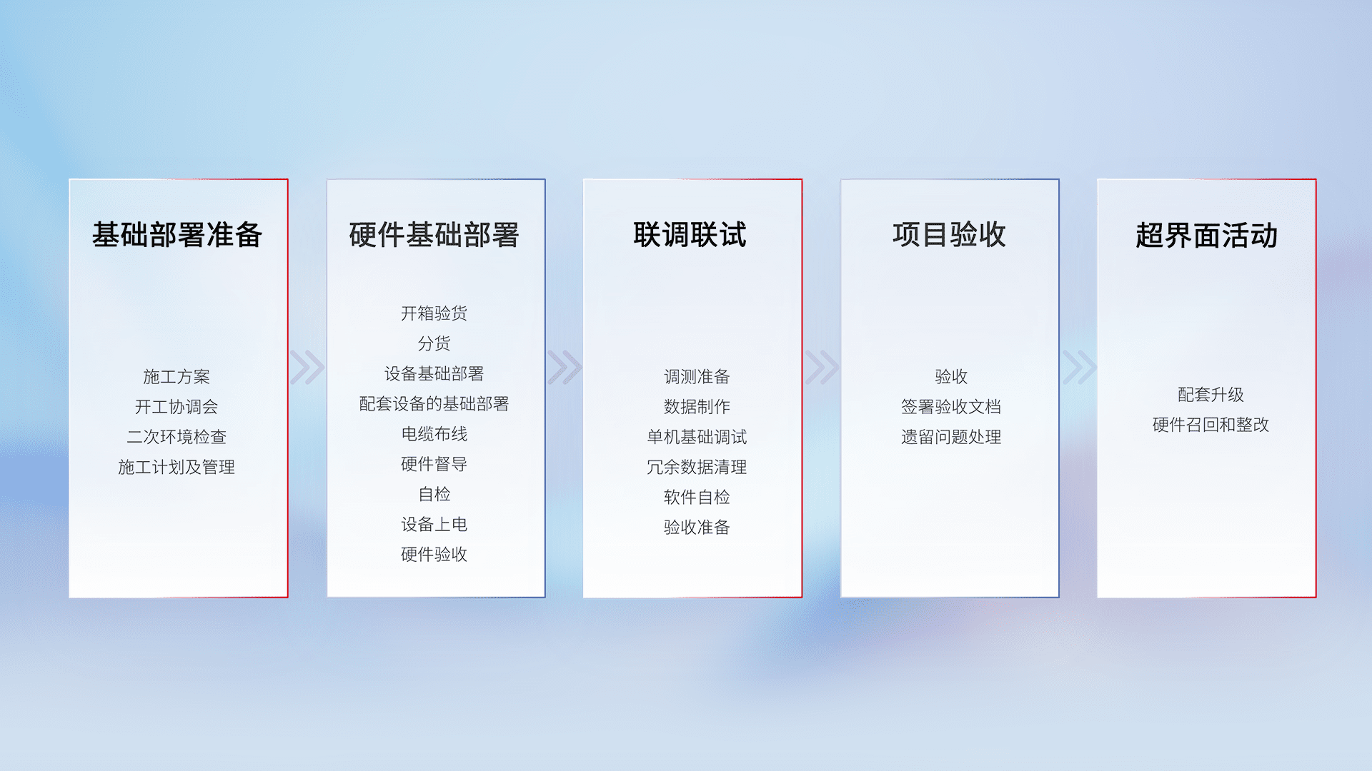 从基础部署准备、、、硬件基础部署、、、、联调联试、、、项目验收、、、越界面活动的全过程可追溯,,,保证施工质量和进度。。